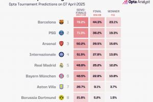 体育资讯04月07日讯 欧冠1/4决赛首回合本周中将打响,权威数据机构Opta今天给出了欧冠8强各阶段晋级以及最终夺冠的概率预测。